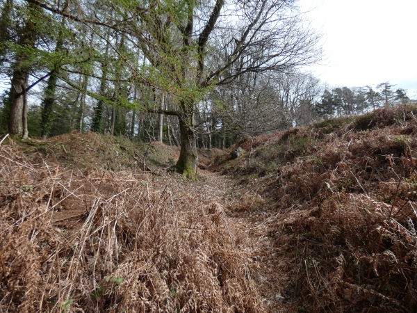 The author visited this site with Steve Szypko on 26/03/26. It is an impressive set of earthworks and we used Gerrard's plan on p.67 to navigate around the site. The extent of the earthworks is quite remarkable with a section south of the road. The photo below shows the hollow-way described by Fox.