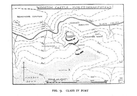 Wooston Castle on the south bank of the Teign near Moretonhampstead, Devon, is a structure that resembles the hill-slope forts in certain ways, yet its peculiar plan and situation demand it be assigned to a separate category. The whole fort lies on sloping ground between Mardon Down and the edge of a precipitous fall to the river, running in a wooded gorge, 250 ft below. Thus, whilst the inner zone has good natural defences on the north, the fort as a whole is at a disadvantage in relation to the plateau.