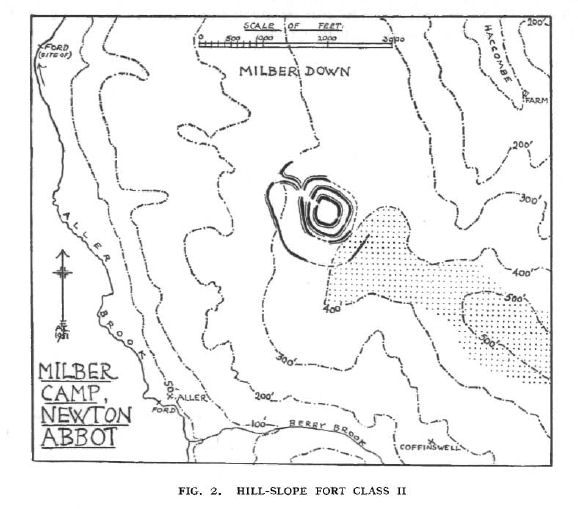 Milber Down hillfort is an Iron Age multivallate hill-slope fort, consisting of four roughly concentric and fairly widely spaced ramparts with outer ditches.
