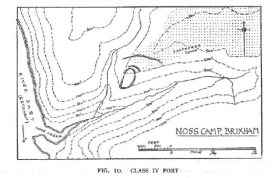 One other Devon fort, Noss Camp, near Kingswear on the lower Dart (Fig. 10) also combines promontory and slope techniques. The inner enclosure occupies a steeply sloping end of a spur between two streams which unite at Noss creek : it is strengthened by an extra semicircle of bank on the upper side in the manner of a Type I fort. The outer enclosure, which may be an addition, is formed by a rampart drawn across the spur 100 yards distant, in the normal manner of a promontory fort. The entrances to the inner enclosure appear to be at the sides, but modern field roads have confused them. References