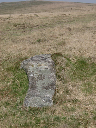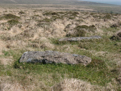 Of the 120 remaining stones only 12 remain earthfast (west of the trackway) and these are all tilted far to one side. The rest are lying flat mostly where they fell with the long axis aligned along the row. About 10 of the stones have broken into two or more pieces which does not appear to have been done by stone cutters - Butler suggests that lightning could have been the cause. The stones average 1.6 m in length but 26 of them are huge at over 2 m long. The row is aligned east to west, unlike the 4 major long rows in the area that are aligned north to south, namely; Butterdon Hill, Burford, Stalldown and Erme rows. The two rows are both thought to have originally had around 150 stones each. The row curves and alters course fairly sharply along its length. There are no discernable terminal cairns at either end of the rows.